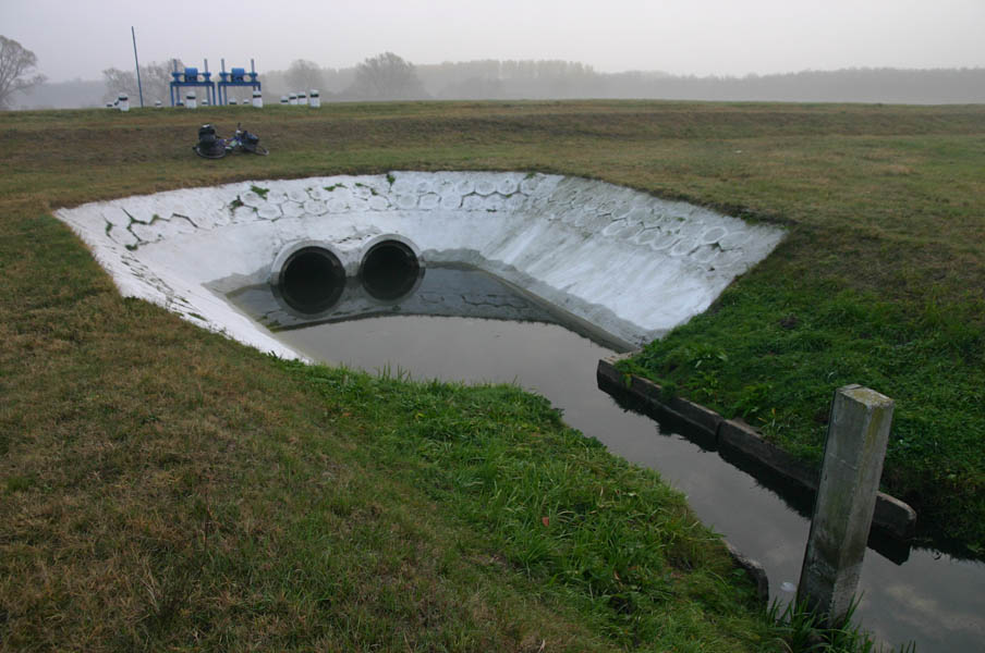 A karcagi szélmalom csak szeptember 30-áig tart nyitva, ezért megcéloztam a túzokrezervátumot. A 4-es úton végig tilosban tekertem, úgy, hogy először a kicsi átkötőn indultam el, de egy nagykun-emlékmű átcsalogatott a főútra. Sajnos elszámítottam magam: a rezervátum túl messze volt. A Hortobágy-Berettyó partja nádasos, alhatatlan, szúnyogos volt, és nem kínált fedezéket. Ezért Ecsegfalva előtt egy szép fiatal tölgyesben tértem nyugovóra. Ez egy telepített erdő volt egyenes sorokkal, valamennyire mégis elrejtett, és szerencsére a közelben nem is volt tanya. A zuhanyzás sok lágy vizet fölemésztett a kulacsaimból, pedig holnap szerettem volna főzni.