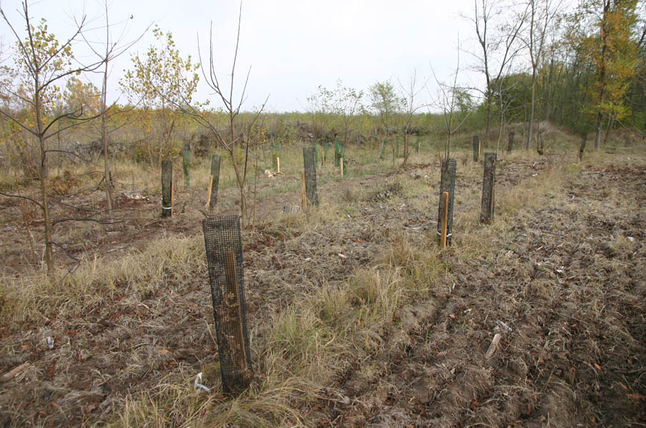 Létavértesen egy Irinyiről elnevezett vízi vágóhíd található, de nem tekintettem meg. Vásároltam ropit, darálós linzert, vajat. Hosszúpályi után kitartóan keresgéltem a földikutya-rezervátumot: először a vasúton túlra keveredtem, de csak csemete-telepítéseket tudtam fotózni. Végül egészen az Ördög-árokig, egy honfoglalás kori szarmata földvársáncig hatoltam a vasút mellett, mire meglett. Az ismertető szerint a földikutya, ez a sündisznóhoz hasonló külsejű állat túlnyomórészt föld alatti életet él, ezért ritkán kerül szem elé, csak jellegzetes túrásaiból következtethetünk jelenlétére. Élőhelyeit jobbára felszántották mára; ez a hajdúbagosi rezervátum 1976 óta védett.
